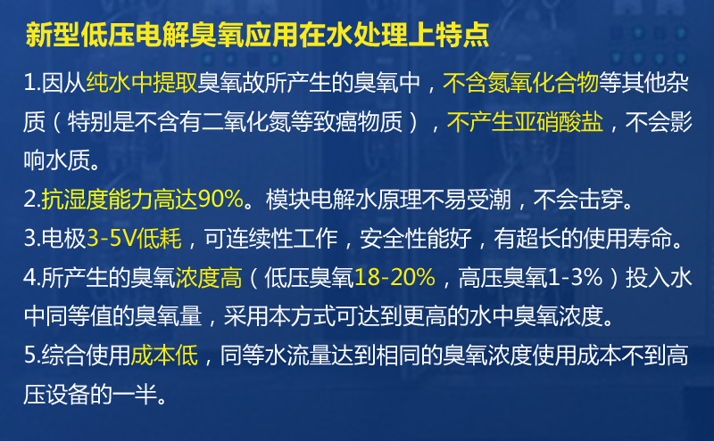 第三代臭氧技术一PEM电解法臭氧生成技术的出现,克服了传统高压电晕法的各种弊端,是当今全球最领先的健康臭氧制取技术,不产生任何二次污染,无静电辐射,噪音小,其核心发生器的核心电极为非消耗型,使用成本低,所产生的臭氧浓度高,特别是所产生臭氧中不含国家环境监测所提出的氮氧化物和挥发性有机污染物,是真正意义上的环保低碳节能型产品。
